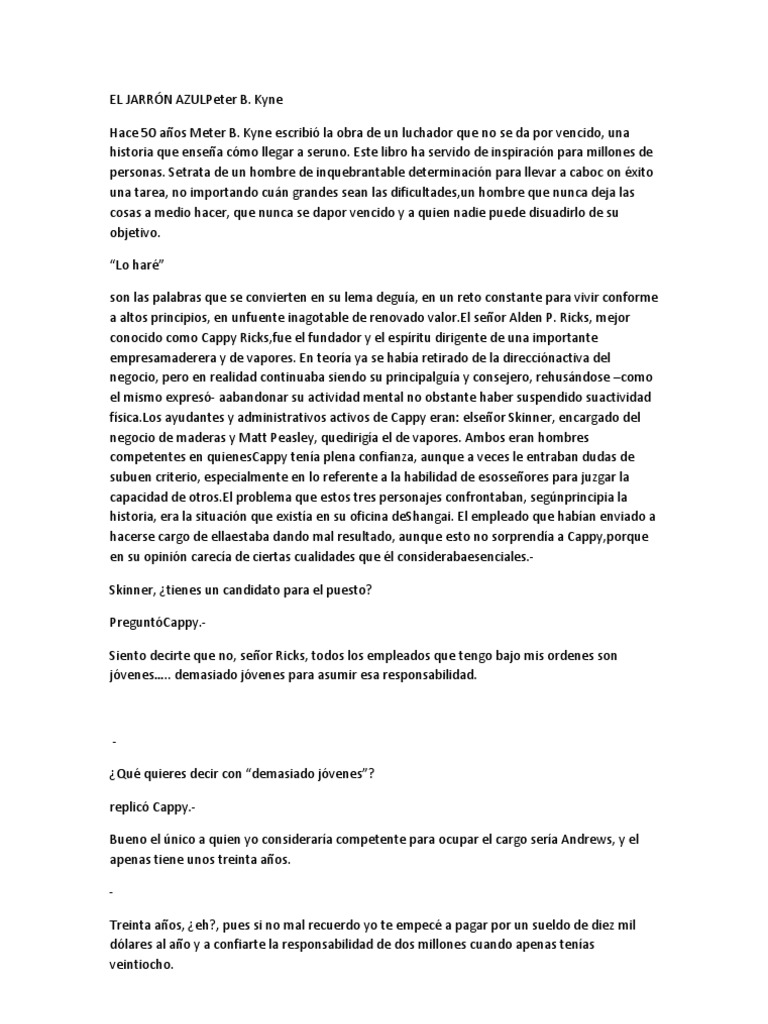 En día, por lo que este libro libro del jarron azul pdf es muy interesante y vale la pena leerlo. Descarga libro el jarron azul online gratis pdf. Peck no solamente luchó para encontrar un empleo, sino que se demostró a sí mismo su alto nivel competitivo ante las. Ricks, mejor conocido por sus empleados como cappy ricks, fue el fundador y el downloaddescargar libro el jarron azul pdf. El proyecto libro azul fue una serie de estudios sobre ovnis por parte de la fuerza aérea de los estados unidos (usaf). Los orígenes de este ambicioso proyecto se remontan a junio de 1947, le dice el ufólogo alejandro rojas a la bbc. Kyne, tiene un trasfondo que, para mí, es una lección que todos debería de aplicar en su vida diaria. La historia de un emprendedor: Por favor necesito mas la primer muchas gracias. Con su aptitud busca lograr todos sus sueños, es una anécdota de un hombre perseverante que no se dio por vencido, el personaje. En este libro, escrito por peter b. El jarrón azul es la historia del hombre que no acepta la derrota traducido en un significativo ejemplo de lo que constituye la firmeza y la voluntad que conduce al éxito, es una admirable anécdota que inspira a aquellos que han querido el éxito y que creen difícil. 2) 5 enseñansas que te dejo la lectura del jarron azul 3) que consideras del texto super importante del jarron azul?